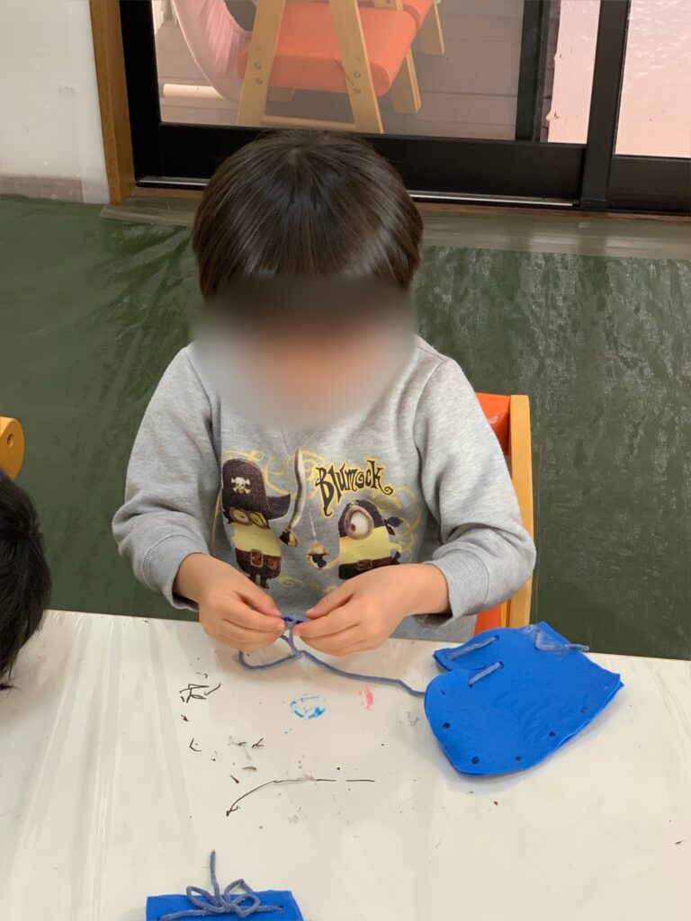 穴が開いたところに紐を通すというものですが、なみ縫いと同じことです!