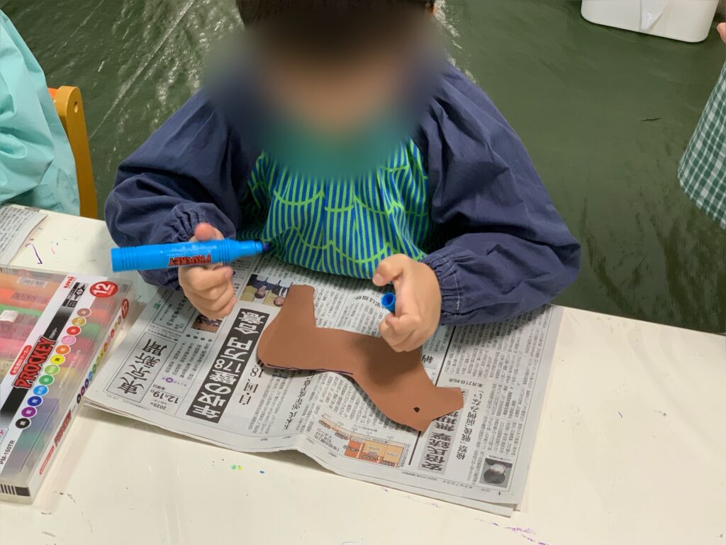 カットしたお馬さんにはクレヨンやマーカーで絵をかいて、その上からデコレーションをします