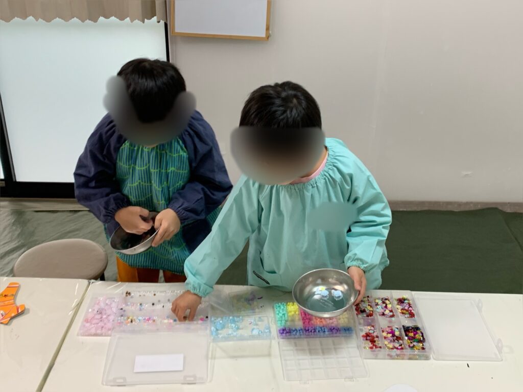 壁に引っかけるための紐は左右均等になるよう取り付けて、ビーズを貼る位置などは工夫を凝らします