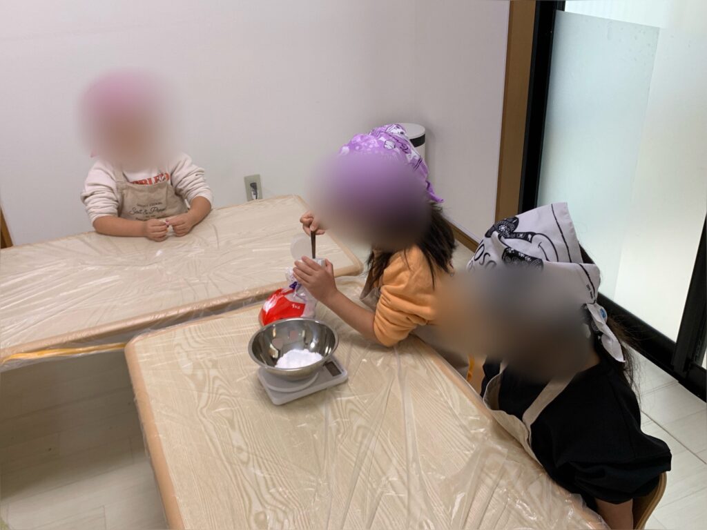 小麦粉と砂糖のグラムを量り、卵を割って、材料を混ぜ、生地を寝かせた後、型ぬきします。本格的ですよね!